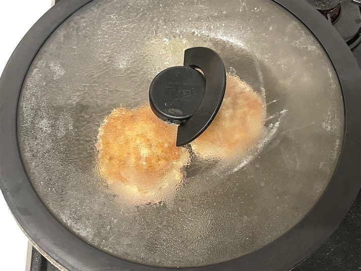 片面は焼き上げ、もう片面はフタをして蒸し焼きすることでハンバーグがしっかり膨らむそう。