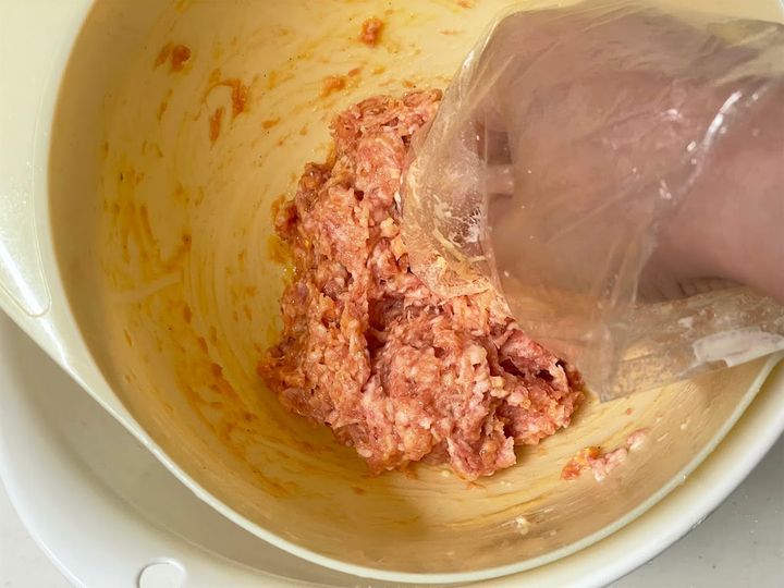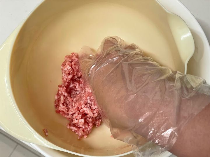 挽き肉が温まると中の肉汁が外に流れ、パサつく原因になるため、冷蔵庫から出したてのものを使いましょう。