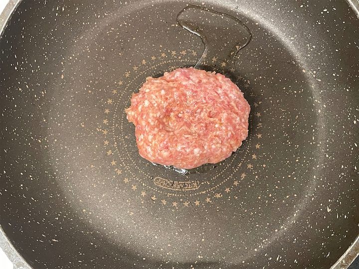 3.手にサラダ油を薄く塗り、肉ダネの空気を抜いて中央部を軽く凹ませ、成形します。フライパンにサラダ油を中火で熱し、片面を焼きます。