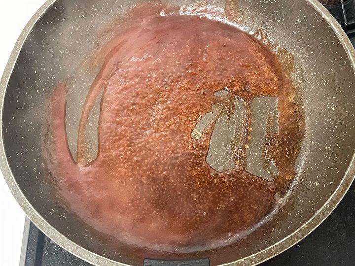 5.ハンバーグを焼いたフライパンにBをすべて入れ、とろみが付くまで弱火で煮詰めます。