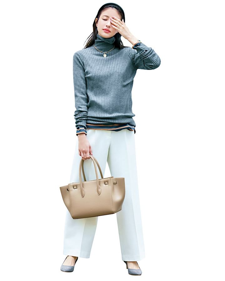 タートルニット¥26,400(サクラ/インターリブ)カットソー¥14,300(ルミノア/ゲストリスト)パンツ¥13,000(PLST)バッグ¥49,500(ヴァジック/ヴァジックジャパン)パンプス¥15,400(ダイアナ/ダイアナ 銀座本店)カチューシャ¥5,500(CA4LA/CA4LA プレスルーム)ネックレス¥8,800(エイチアッシュ/フォーティーン ショールーム)