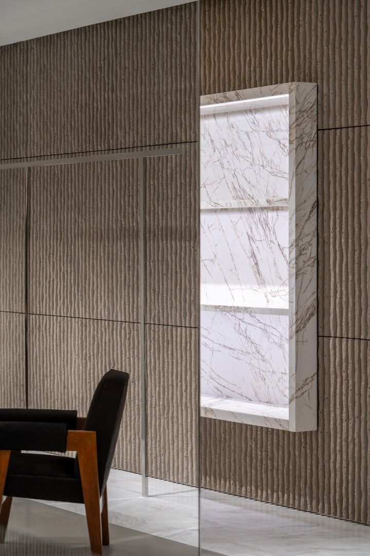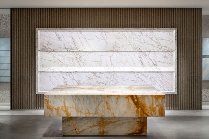 コーデュロイ調のコンクリート壁はラフなレンダリングで仕上げられ、大理石のディスプレイと調和。グレーのコンクリートで構成された床に、ブルールーメンマーブルの什器、ブラウンスパイダーマーブルのニッチ(壁龕)、ジャッロシエナの大理石を用いたテーブルなど、ユニークなファニチャーが設置され、空間全体に独特の調和美を添えている。この店舗では、プレタポルテ、ハンドバッグシューズ、アクセサリーを含むウィメンズ全カテゴリーを展開。