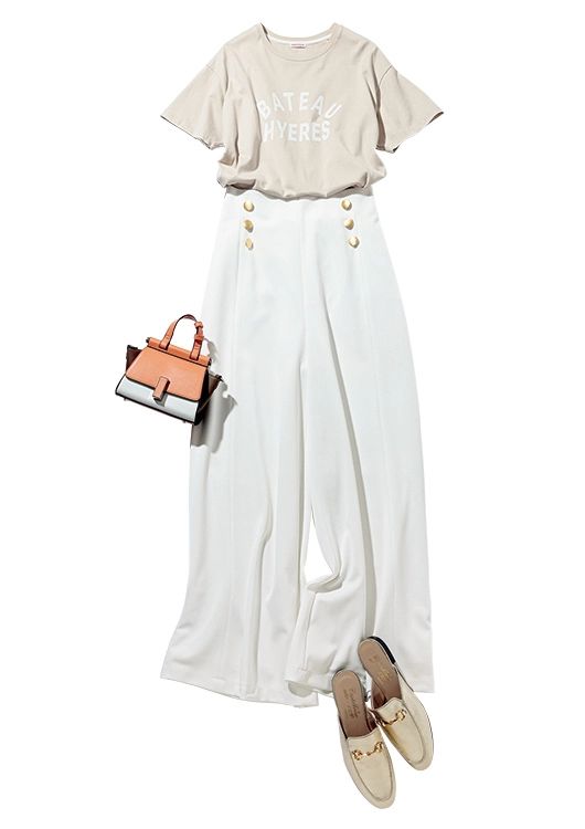 Tシャツ¥5,940/ドレステリア(ドレステリア 渋谷スクランブルスクエア店) マリンパンツ¥18,700/ストロベリーフィールズ(シュガー・マトリックス) バッグ¥17,050/ダイアナ(ダイアナ 銀座本店) ローファー¥35,200/カステラーノ(フラッパーズ)