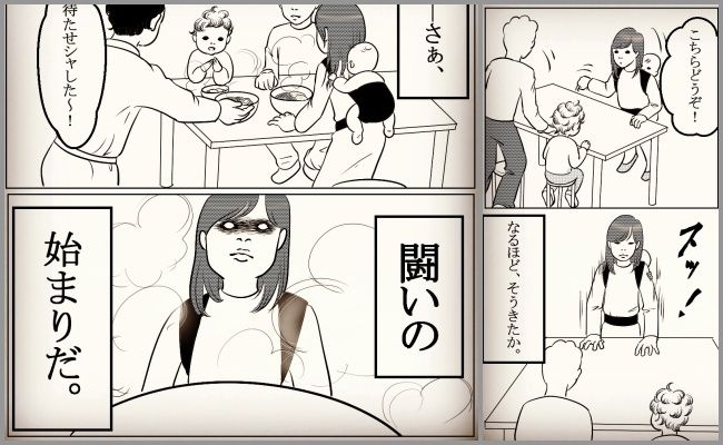 Instagramにて育児マンガを投稿しているmostinさん。2014年生まれの男の子・もすちん/2018年生まれの女の子・ぷんちこ2人の育児に奮闘中!子どもたちを出産する前と後では、ラーメンの食べ方がかなり変わってしまったmostinさん。家族みんなでラーメン屋さんに行ったとき、いざラーメンが運ばれてくると、「闘いの始まりだ」と目つきが一変して……!?