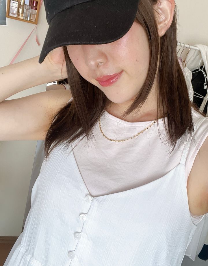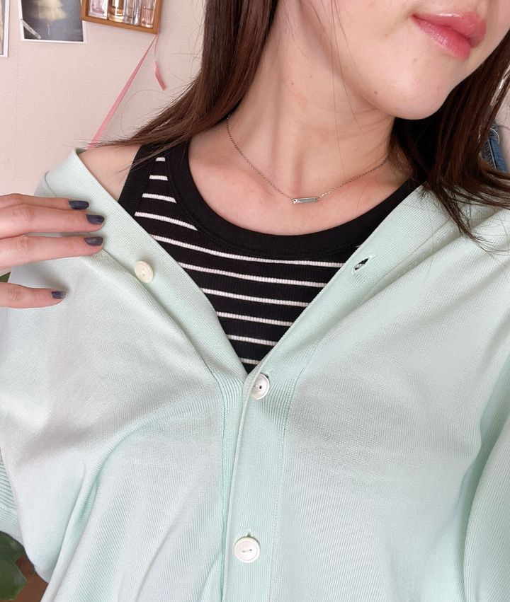 敢えてカーディガンのひとつ目のボタンを外すことで肌をヘルシーにチラ見せ✳︎