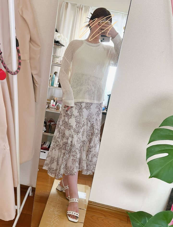 全身を白でまとめることでスカートの花柄がより際立って華やかに♡