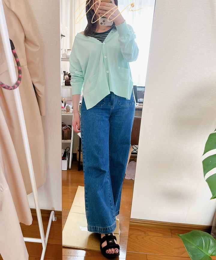 インナーのボーダーに合わせて、爽やかなミントグリーンのカーディガンを合わせたコーデ。