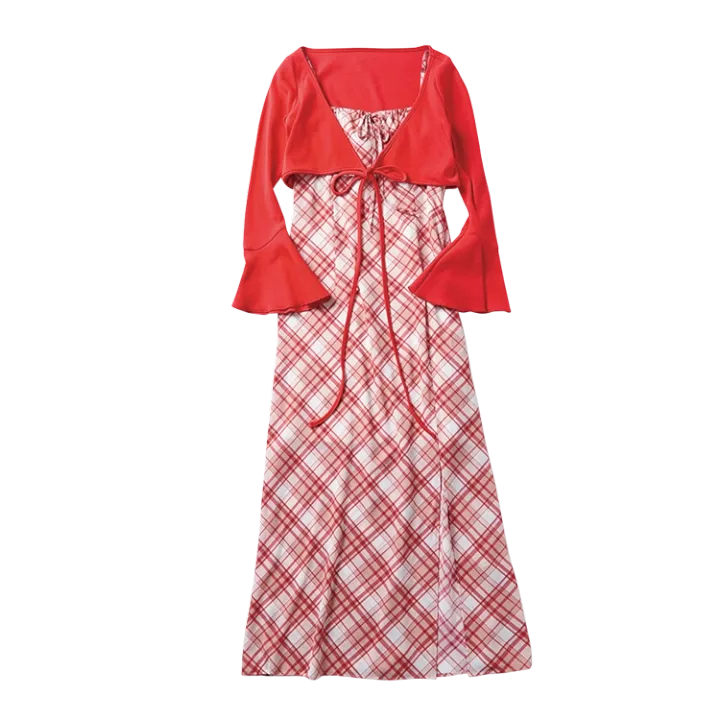 赤カーディガンとプリントワンピースのセット 19,910円/LILY BROWN
