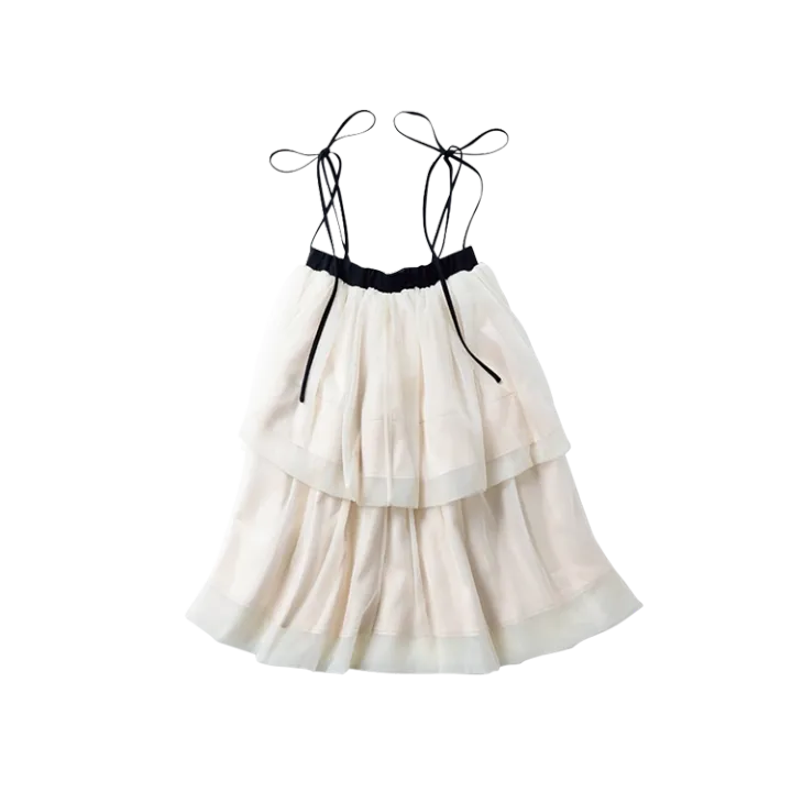 ミニ丈ながらお上品な透け感で子どもっぽい印象を回避。肩ひもリボンでガーリーに仕上げて♡