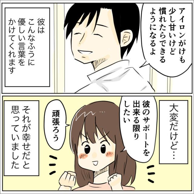 「アイロンがけも少し甘いけど慣れたらできるよ。」夫はできてない部分を優しく教えてくれます。毎日やることが多いけれど彼のサポートをするのが私の役目「頑張ろう!」そう思っていました。それが幸せだと思っていました。