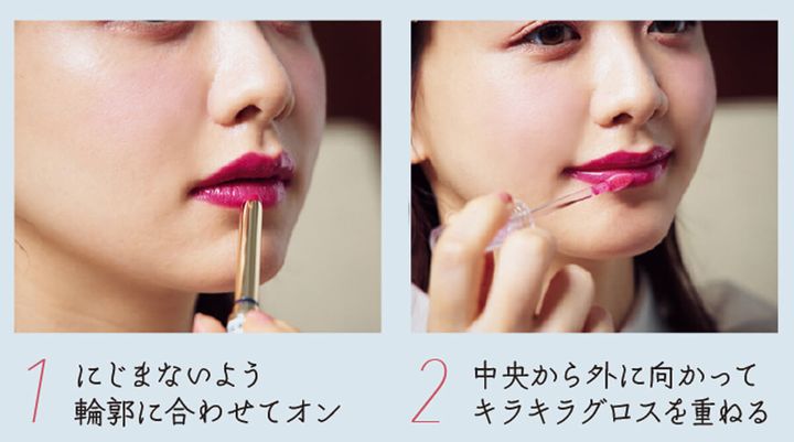 エスティ ローダーのリップはヴィヴィッドな発色なので、口角や上唇の山を丁寧にとりながら塗って上品に見せて。グロスは全体的に密着させて、ラメ感をしっかりアピール。