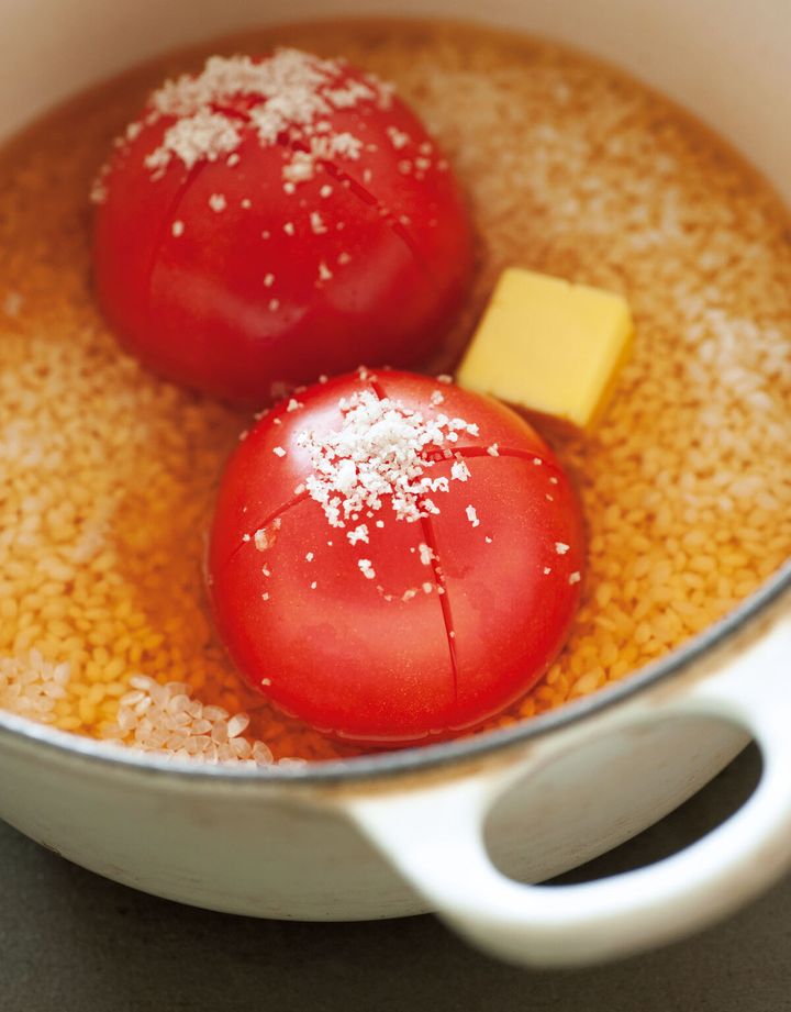 (2)米の上にトマトを切れ目を上にして置き、塩をふる。ふたをして強火にかけ、煮立ったら弱火にし、13分ほど炊く。