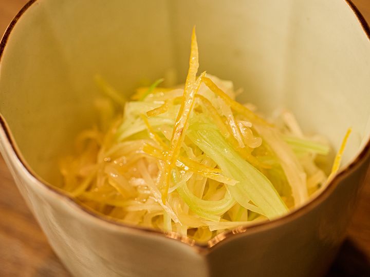 「クラゲの冷菜」は千切りしたクラゲときゅうり、新生姜に加え、発酵レモンが夏らしく爽やかに彩る。