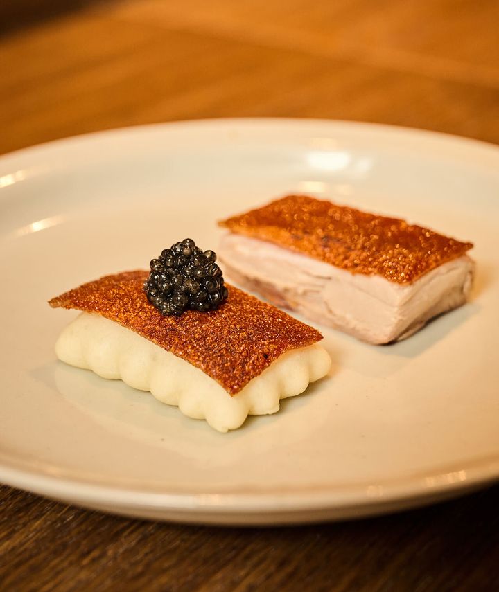 「仔豚の2種炭火焼き」。手前は蒸しパンとキャビアの組み合わせ