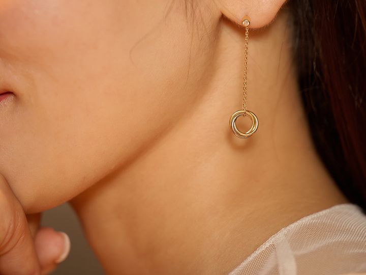ホワイト、イエロー、ピンクの3つのゴールドが絡み合い揺れるさまは美しく、顔周りを華やかに包み込んでくれる。