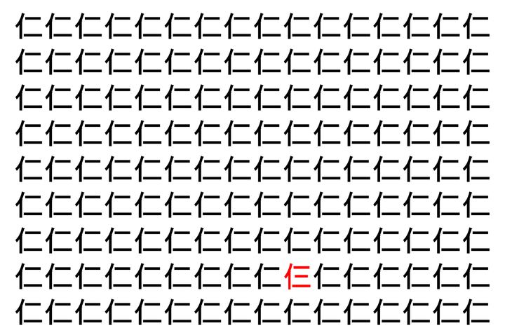 画像の中には、「仁」という漢字が縦に9行、横に16個並んでいます。 全部で144個となりますが・・・、そのうち1つは「異なる漢字」となってますよ!!