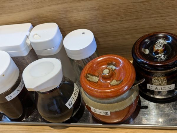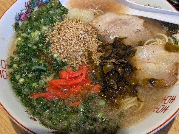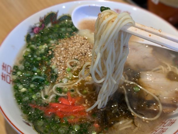 THE 豚骨な王道の博多ラーメン!一口すすってみると、丁寧な仕事を感じる濃厚な豚骨スープです。豚骨ならではの脂っぽさがありつつ、それ以上に旨みを感じる濃厚スープで、調整を重ねたというのも納得のおいしさ。 「白ごま」「胡椒」「ラーメンたれ」「おろしにんにく」など、味変アイテムも豊富ですよ。