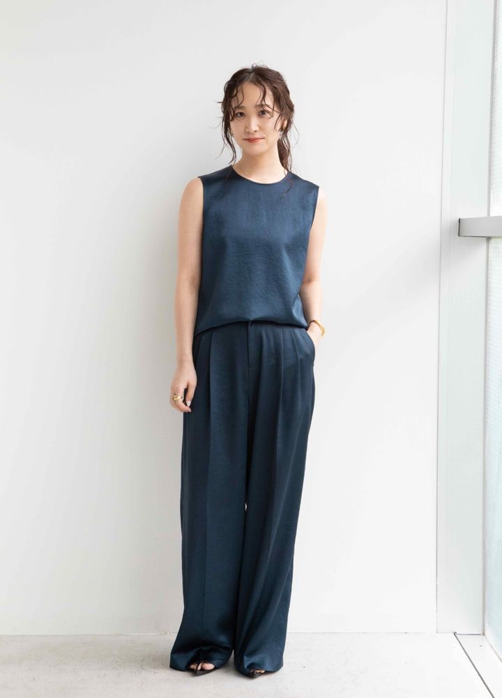 「ヴィンテージライクなサテン素材の光沢感が気に入っているセットアップ。シルエットや素材感の美しさを生かしたく、小物もあえてミニマルにまとめシンプルに着てみました。ネイビーカラーを軽やかに見せるために、足元は肌見せの多い華奢なサンダルでヌケ感を意識しました」