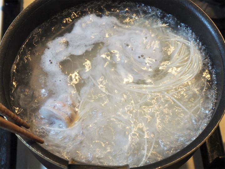 5. 氷水を用意して置いておく。鍋で湯を沸かし、豚肉、そうめんを入れ茹でる。豚肉は30〜40秒茹でたらお皿によけ、そうめんは1分茹でていく。