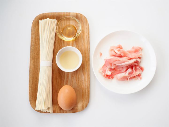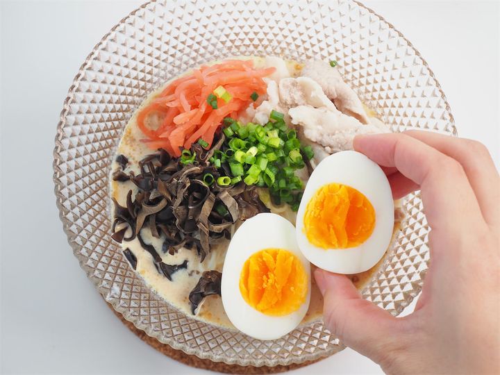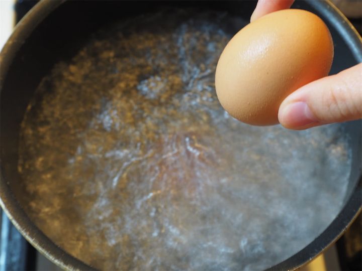 冷蔵庫から出したばかりの卵なら7分30秒、常温の卵なら6分30秒〜7分でOK!卵はなかったらなかったでもおいしいから個人の判断で入れてとのこと。茹でている間に他の工程を進め、茹で上がったらすぐに殻を剥くようにしましょう。