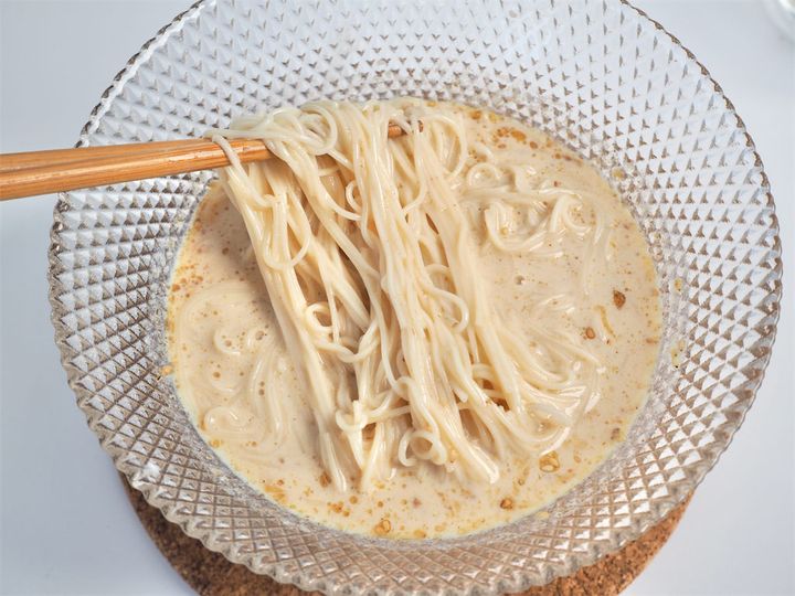 見た目はもうとんこつラーメン!食べてみると、濃厚でまろやかな豆乳スープ。やさしい甘みのある味で、あっさりかと思いきや旨味がしっかりと残ります。かつお粉が効いていて魚介系のとんこつといった感じです。食べた瞬間、そのおいしさに思わず笑ってしまいました。そうめんの細い麺が、とんこつラーメンの麺のようです。硬めに茹でている点も再現されてる!うん、これはとんこつラーメンだ。でも豚骨ではないので臭みはなく、こってりし過ぎていない程よいコク。個人的にはラーメンより好きかも!