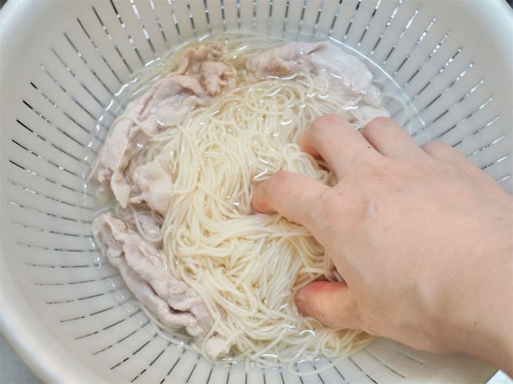 6. 茹で上がったそうめんはザルにあげ流水で洗ったら、豚肉と一緒に氷水で約30秒締める。