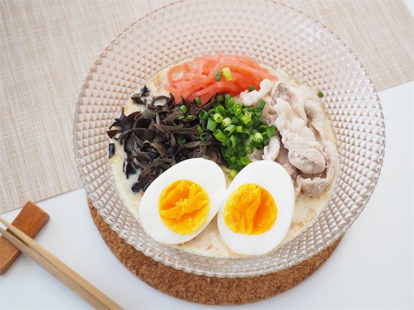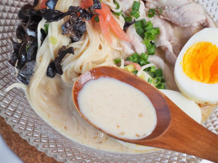 白ゴマ、きくらげやゆで卵のトッピングもよく合います。豚肉はごく薄切りとか、しゃぶしゃぶ用のお肉の方がやわらかくていいかも。特に紅しょうがは、とんこつラーメン感も味わい深さも増し増しに!そしてこのそうめんは、豆乳が大きなポイント。レシピ名に豆乳ってつけて欲しいくらい。おいしいからというのはもちろん、豆乳だからこそスープも全部飲みきりたい気持ちになります。前衛的でおしゃれなお店で出てきそうなアレンジそうめん、これはさらに再生数が伸びそうです♪