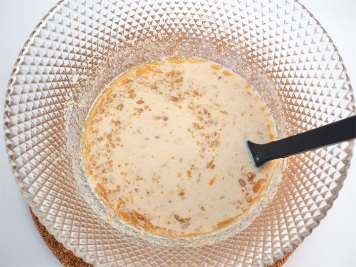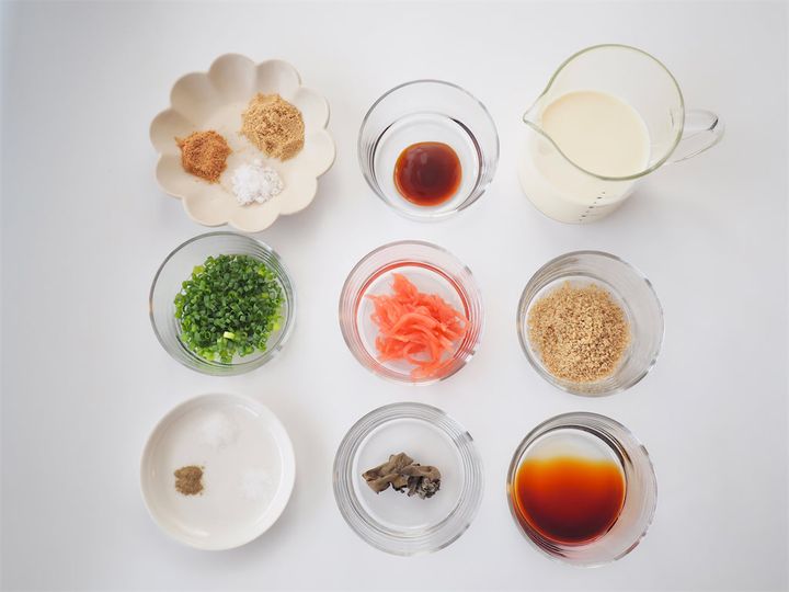 3. 器に無調製豆乳、中華料理用調味料、しょうゆ、オイスターソース、砂糖、かつお粉、白すりゴマ、ゴマ油、こしょう、塩を入れよく混ぜ合わせ冷蔵庫で冷やしておく。