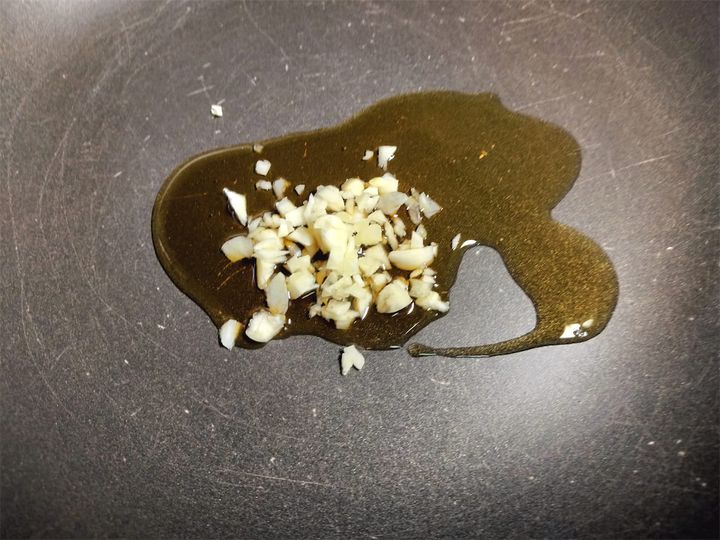 1. フライパンにゴマ油を入れて中火にかけ、にんにくを炒めます。