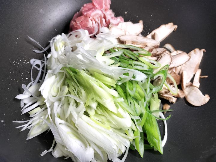2. 香りが立ったら豚肉、しいたけ、長ねぎを加えてさらに炒めます。