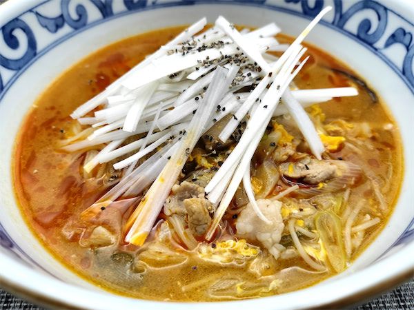 麺の細さはどう見てもそうめんですが、溶き卵の黄色とラー油の赤色が鮮やかなサンラータンが出来上がりました。そうめんを持ち上げるととろみの付いた汁がついてきて、口に入れると適度な酸味と辛みが広がります。この酸味と辛みの広がりは、温かい食べ物特有のもので、冷たい麺では出せない効果です。食べなれたそうめんなのにまるで細い中華麺を食べているような食感で、これは茹で時間を若干短くしたことによる効果だと思います。普段のそうめんとは合わせない白髪ねぎや黒こしょうもいいアクセントで、そうめんのレパートリーがひとつ増えました。