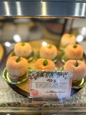 旬の果物を使ったケーキです。 ティコラッテ”初”「もも祭り」が開催中で、シェフ達が心をこめて創った芸術作品のようなケーキが、おいしそうな顔で並んでいます。