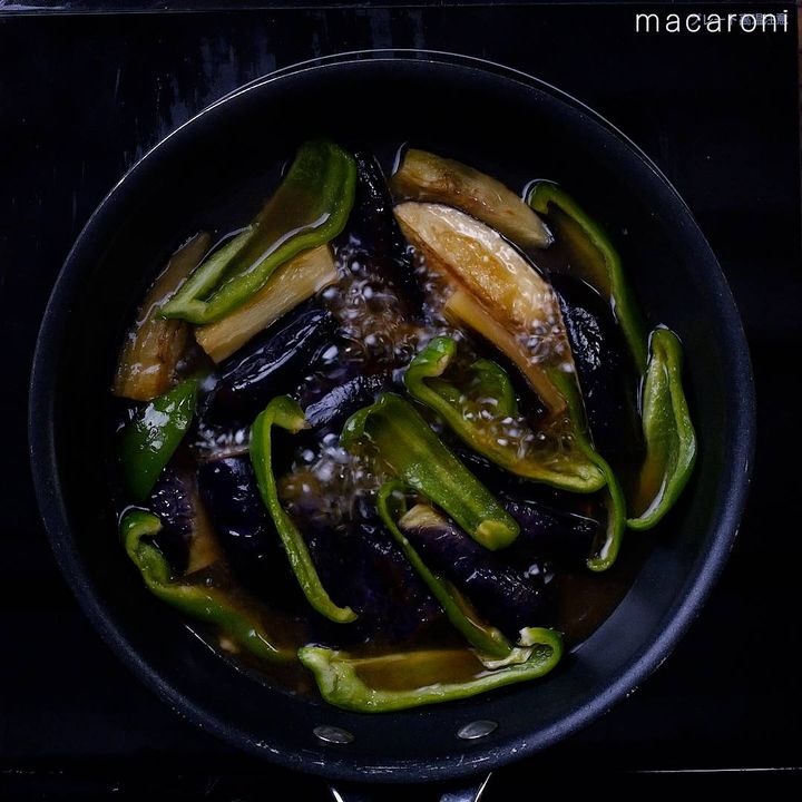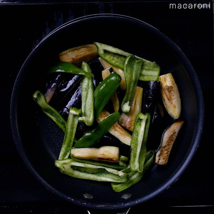 3: なすに焼き色がついてきたら、ピーマンを加えてさらに焼きます。