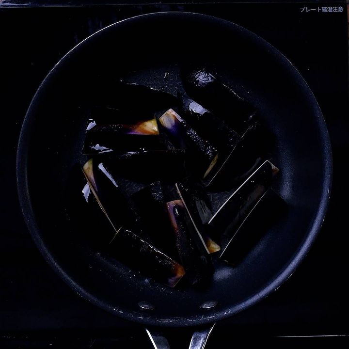 2: フライパンにごま油を引いて中火で熱し、なすの皮を下にして焼きます。