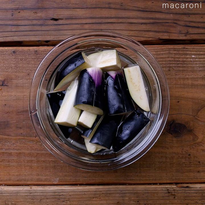 1: なすはヘタを除き、横半分に切ってから、縦4等分に切って水にさらします。
