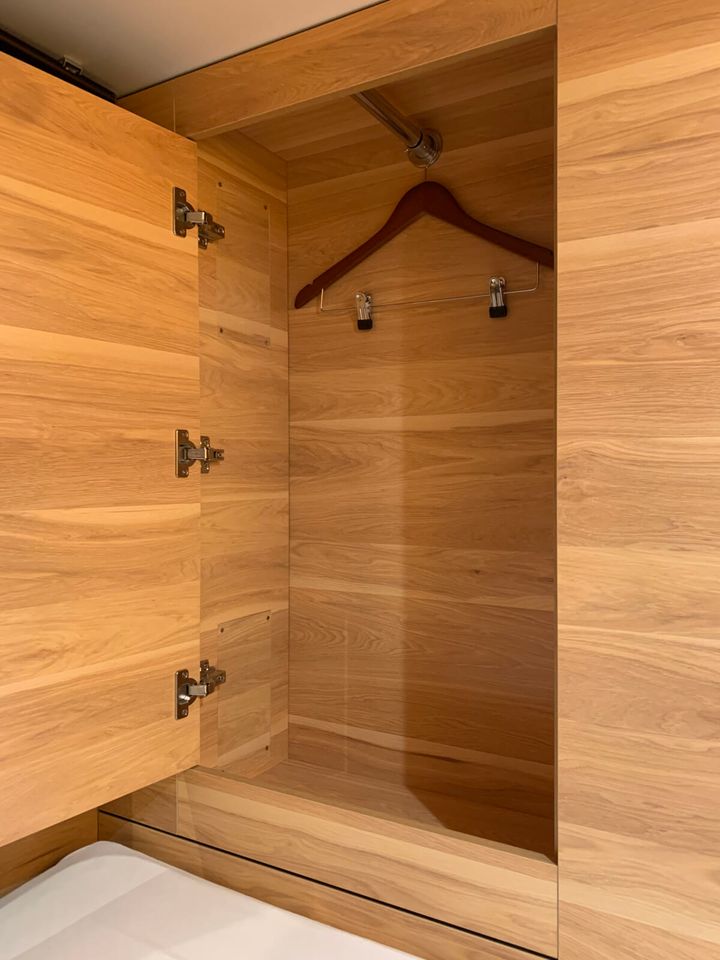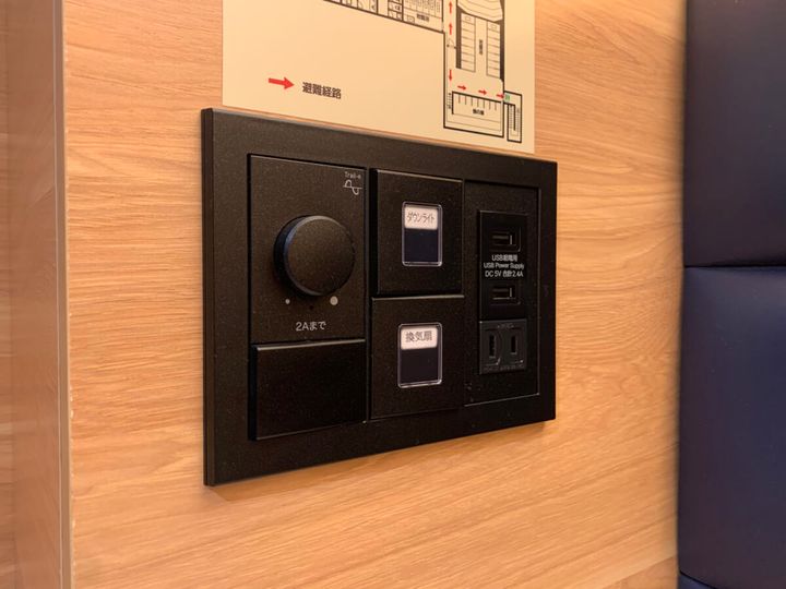 ベッドの脇にある暗証番号式のロッカーは、翌日着る服が皺にならないようハンガーも用意。枕元には鍵付きのセーフティーボックス、USBポートが2つ、100V電源コンセントが1つあり充電にも困りません。もちろん館内では無料のWi-Fiも利用できます。