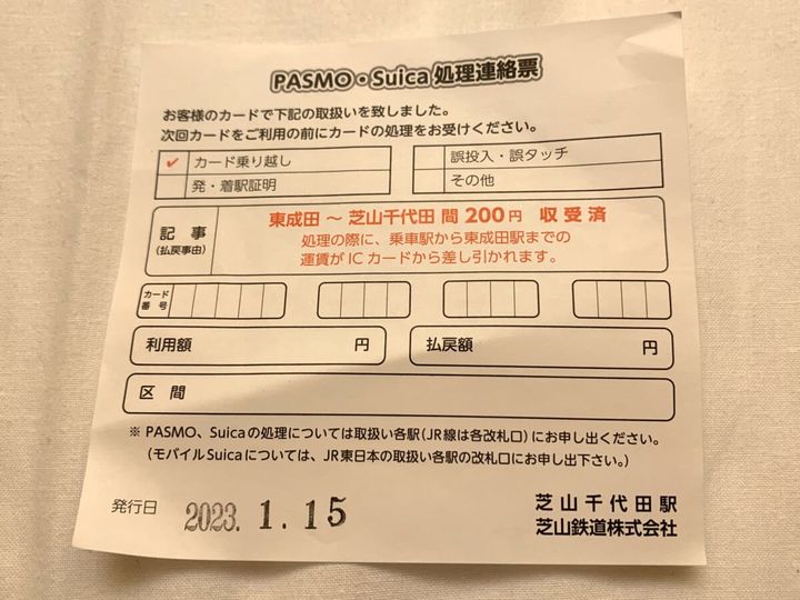 ICカードで乗車してきた場合、このような処理連絡票というものをもらうことができますが、旅行中もこの紙をなくさずに持っているのは少し大変ですよね。あらかじめ切符を使って芝山千代田駅まで乗車してくるのがスムーズですよ。また、帰りだけ駅を利用する場合も、券売機で切符の購入が必要なので現金の用意をお忘れなく。