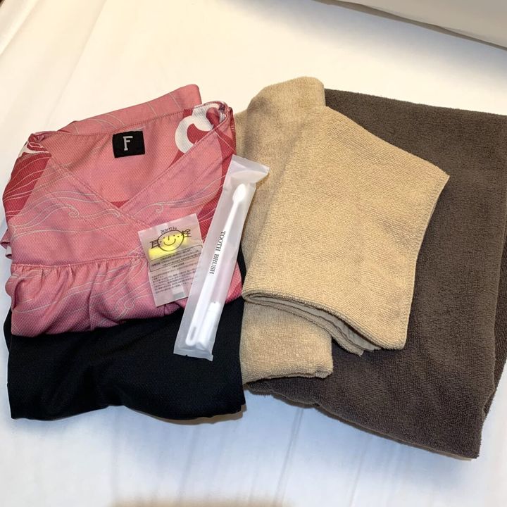 アメニティはレンタルのバスタオル、フェイスタオル、岩盤浴用大判タオル、館内着に加えて、歯ブラシと耳栓をいただきました。着替えを余分に持ってくる必要がなく助かります。温泉スペースにはドライヤー、シャンプー、コンディショナー、ボディーソープ、綿棒も備え付けてあるので、スーツケースをあけることなくすべて利用できるのがうれしいですね。