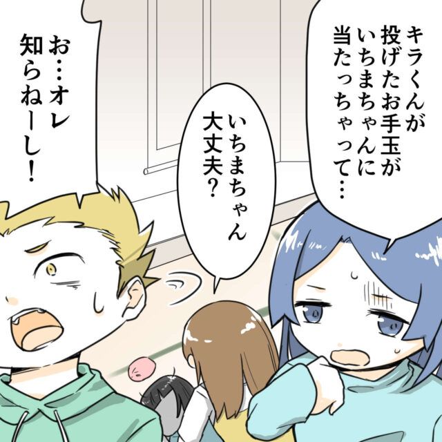 「いちまちゃん大丈夫?」とは心配そうです。そしてお手玉を投げたと言われたキラくんは「お・・・オレ知らねーし!」と自分がやったことを否定します。