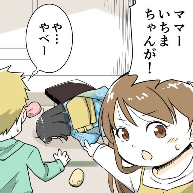 「ママーいちまちゃんが!」ユイが大きな声で呼びます。見に行ってみると、いちまさんがうつ伏せに倒れていました。そのそばで「や・・・やべー」と焦るキラくん。