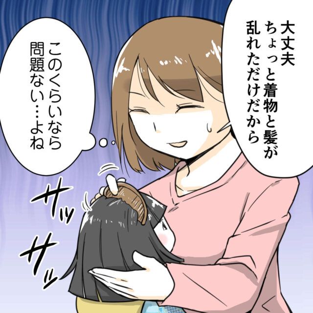 私は「大丈夫。ちょっと着物と髪が乱れただけだから。」と言って櫛でいちまさんの髪の毛をとかしました。