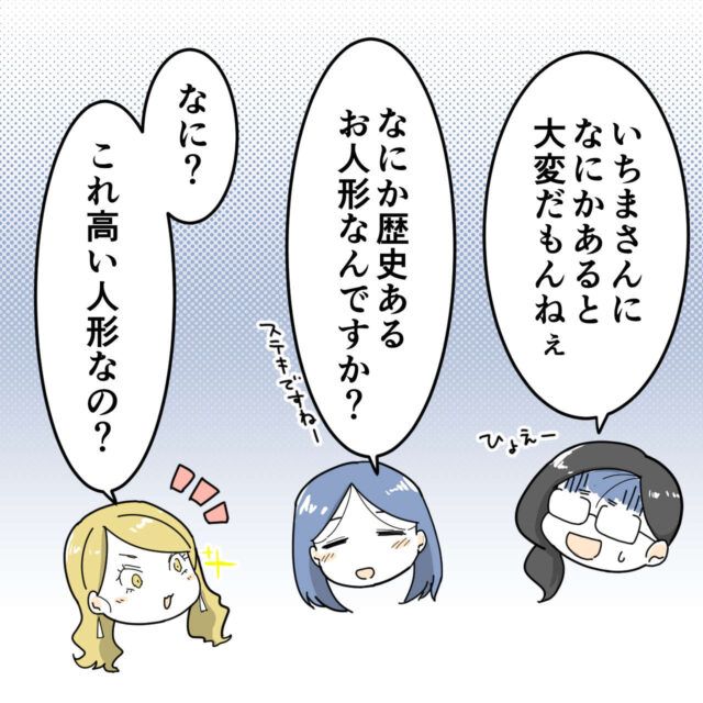 「なにか歴史があるお人形なんですか?ステキですねー」と渡辺さん。一方キラくんのママである山本さんは、歴史があると聞き「なに?これ高い人形なの?」と興味津々です。