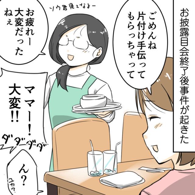 「ごめんね。片付け手伝ってもらっちゃって。」「お疲れー、大変だったねぇ。」と後片付けをてつだってくれたミチコと話していると、「ママー!大変!!」とまたユカが大声を出します。