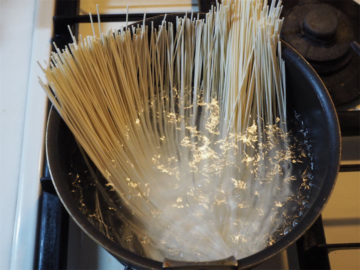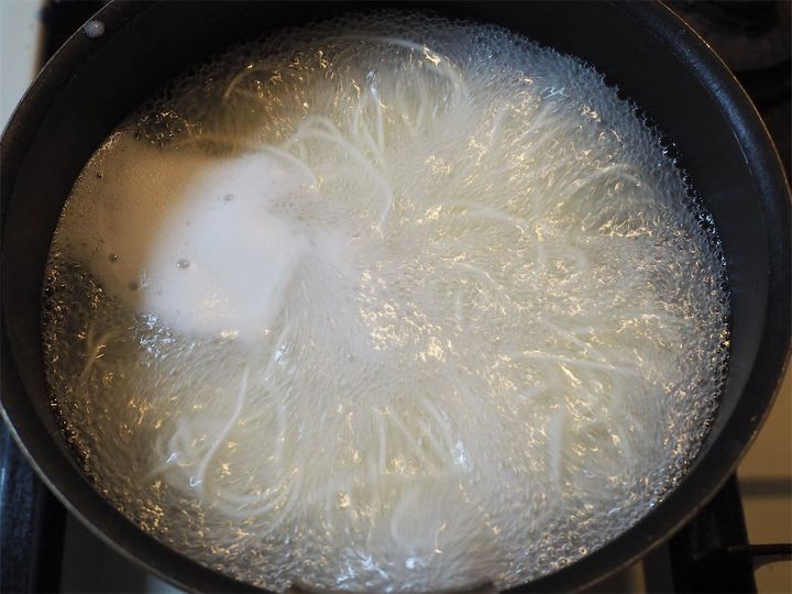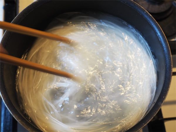 2. 鍋に水を入れ強火にかけ沸かし、麺を扇状に広げるように入れる。麺がすべて鍋に入ったらくっつかないようかき混ぜる。