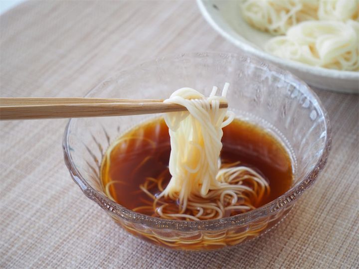 どんな違いが出るのだろうとワクワクした気持ちに。食べてみると、麺にまとわりつくぬめりや、ボヤっとした感じがなくつるつるとこしを感じます。すっきりとした口当たりで、基本を守るとやはり違うなと実感。氷水で締めたおかげもありますが、キュッと締まった麺の口当たりは、どこか涼やかさも増しているように感じます。手作りめんつゆは、そうめんと一緒に吸い込む時にふっと入ってくる風味がすごい!「豊か」って言葉がぴったり。かつお、昆布と2種類のだしの素がこれでもかと、味わいと風味を豊かにしてくれています。関東だしと関西のだしを合わせたようないいとこ取りのバランスです。
