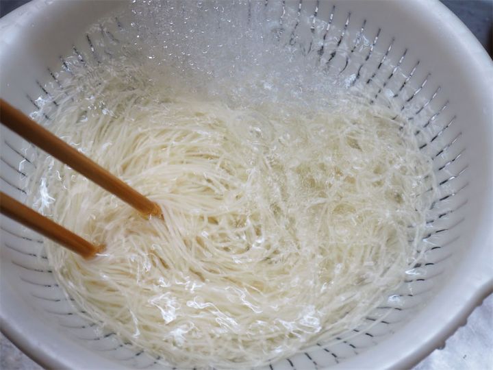 4. そうめんの袋に記載されている茹で時間よりも10秒早く火を止め、ザルにあげてからザルごと鍋に戻し、流水下で菜箸でかき混ぜるようにしてよく洗い、ぬめりをとっていく。