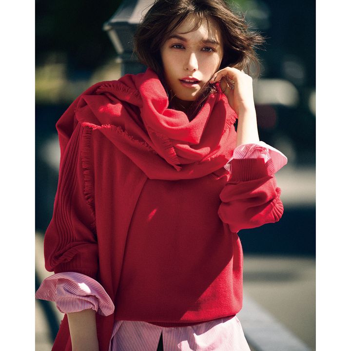 パワフルで存在感のある赤が、久しぶりに秋冬のテーマカラーとなりそう。ストールを巻いたり、羽織ったり、着こなしにリズムをつけて…シンプルニットに、ストライプシャツで抜け感と遊び心を。ストール¥47,300(アソース メレ フォー ロンハーマン/ロンハーマン)ニット¥9,999(デッサン/ワールド プレスインフォメーション)シャツ¥19,910(シップス/シップス インフォメーションセンター)リング¥45,100(ジョージ ジェンセン/ジョージ ジェンセン ジャパン)