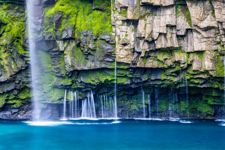 大河ドラマ「西郷どん」や映画「キングダム」のロケ地にも使用された人気の観光地です。雄川上流にあり、エメラルドグリーンの滝つぼは息をのむほどの神秘的な美しさ。駐車場から滝つぼまでは約1200メートルの遊歩道があり、四季折々の風景を楽しめます。遊歩道にはほどよい勾配があるので動きやすい服装がおすすめです。