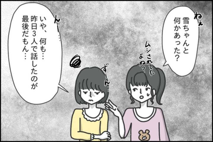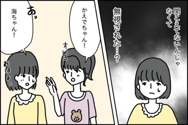 この漫画はミント・スカッと体験談マンガ(@minto_suga22)さんの妹・かえでに関する体験談です。かえでが小学4年生のころ、雪ちゃん、海ちゃんというお友達と仲良しでした。しかしある朝登校すると、雪ちゃんからいきなり無視されるように。この子ども同士のトラブルが、のちにお互いの母も巻き込む騒動に発展するのでした…。雪ちゃんに挨拶を無視されたかえで。それを見て海ちゃんも手を振ってみますが、雪ちゃんはやはり無視。それどころか鋭い目つきでこちらをじっと見てきて…?『嘘つきママ友に嵌められました』第3話をごらんください。