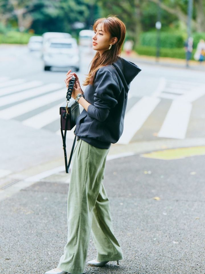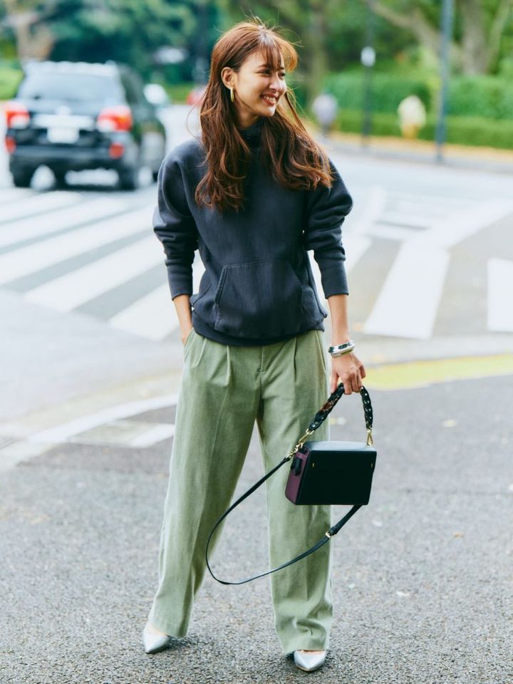 おしりにちょっとかかるくらいの丈感で、後ろ姿もすっきりした印象。フーディ¥34,000(エイトン/エイトン青山)パンツ¥28,000(ア ピューピル/UTS PR)バッグ¥24,500(インターステイブル/アバハウスインターナショナル オンラインストア)パンプス¥16,000(アプローチ/アースマーケティング)ピアス¥7,440<マシェット>バングル¥32,000<パズ コレクティブ>(ともにZUTTOHOLIC)